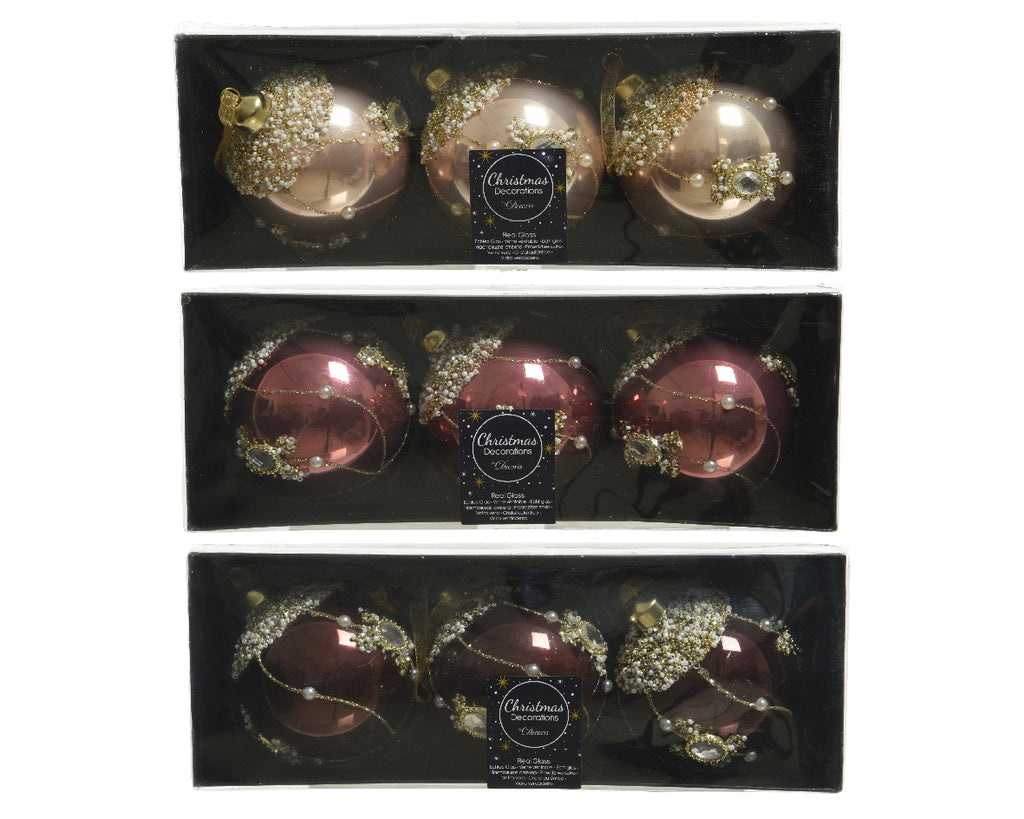 BOX 3 PALLE DI NATALE VETRO D 8 CM SOFT PINK DECORO ORO