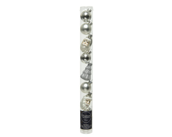 All'interno della confezione sono presenti palline di Natale con i seguenti motivi: pallina lucida (3x3 cm), pallina opaca (3x3 cm), albero di Natale con glitter (3x5,4 cm) e testa di Babbo Natale con cappello (2,8x2,7x6 cm).