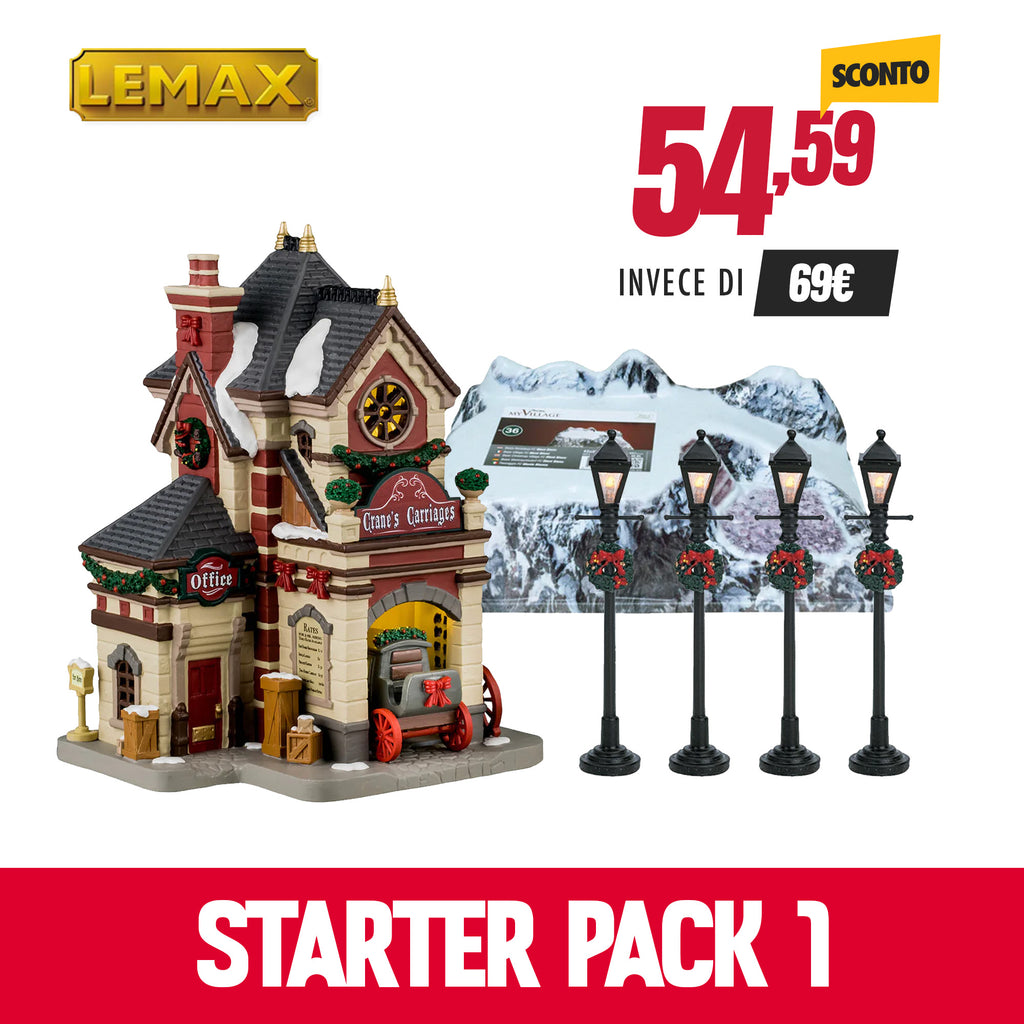 Lo Starter Pack Livello Essenziale è un kit per costruire il tuo primo villaggio di Natale Lemax in miniatura ed è composto da: